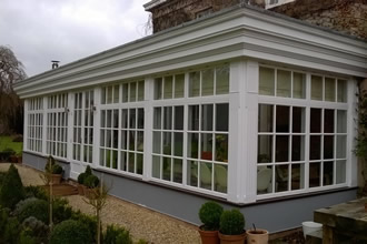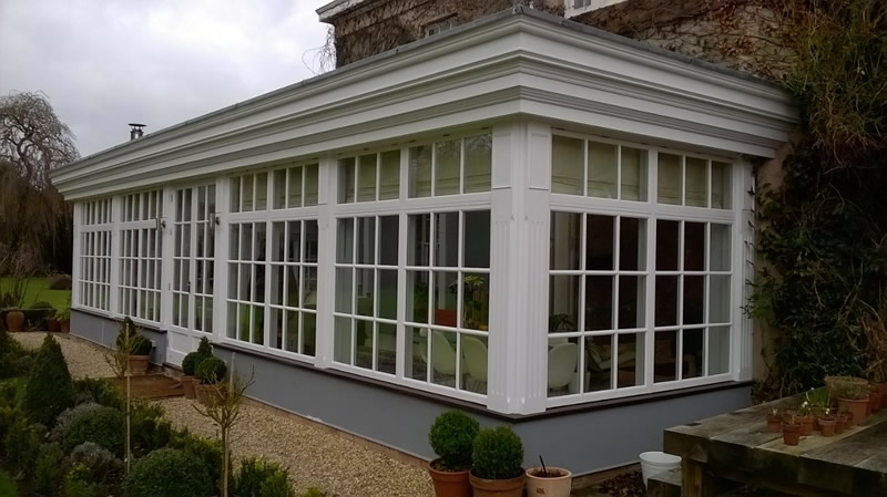 This is a conservatory in Windmerpool, steel frame clad in softwood then painted.