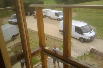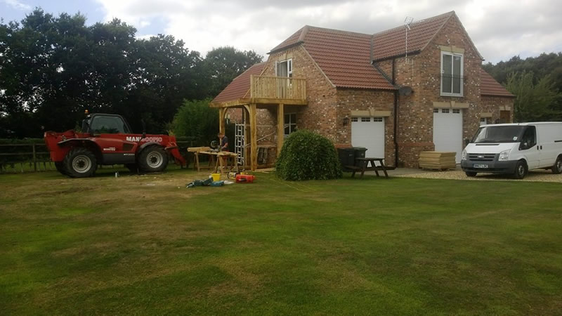 Sun balcony, construction of Romeo and Juliet balcony and view out of bedroom to unfinished Romeo and Juliet balcony. - A sun balcony, Old wood Skellingthorpe made on site from green oak.